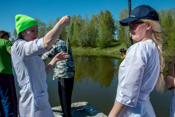 В минувшую пятницу на территории Архангельского клинического онкологического диспансера состоялась уже традиционная рыбалка, приуроченная ко Дню медицинского работника. Принять участие в мероприятии могли не только сотрудники АКОД, но их родственники и пациенты. Местом для ловли традиционно стало озеро, расположенное на территории диспансера. Рыбалку начали с регистрации участников и жеребьевки: для каждого было отведено индивидуальное место для ловли. Под восторженные возгласы групп поддержки участники одну за другой вынимали рыбок из озера, а бодрость духа поддерживала невероятно солнечная погода.