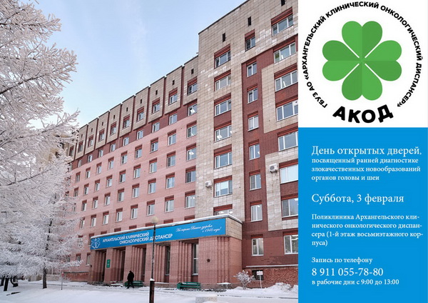 В субботу, 3 февраля, в поликлинике Архангельского клинического онкологического диспансера (1-й этаж восьмиэтажного корпуса) пройдет день открытых дверей, посвященный ранней диагностике злокачественных новообразований органов головы и шеи (это кожа лица и шеи, гортань, полость рта, глотка, полость носа и околоносовые пазухи, слюнные железы).