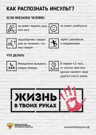 Распознать инсульт можно по следующим симптомам: если у человека повисла рука, опустился угол рта, он не может говорить и не реагирует на обращенную к нему речь, теряет равновесие и координацию движений – с высокой долей вероятности можно говорить об инсульте. И, значит, нужно немедленно вызывать «скорую помощь».